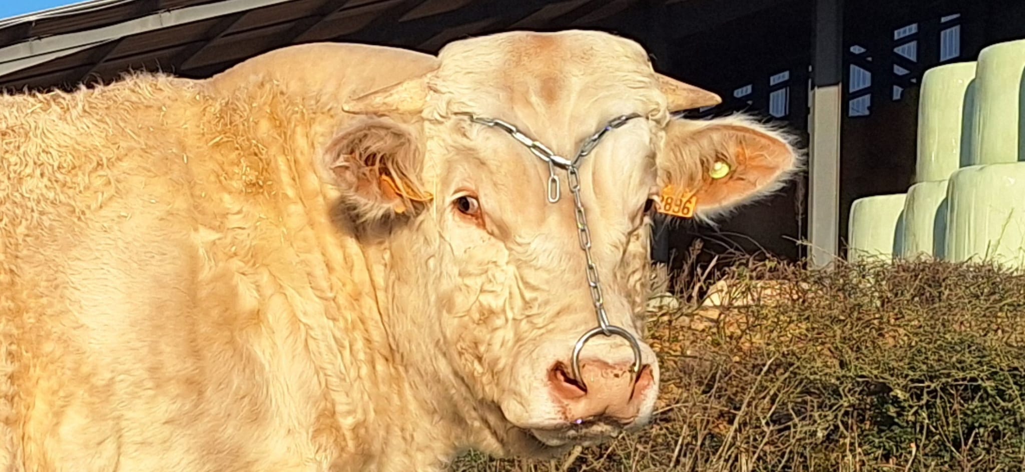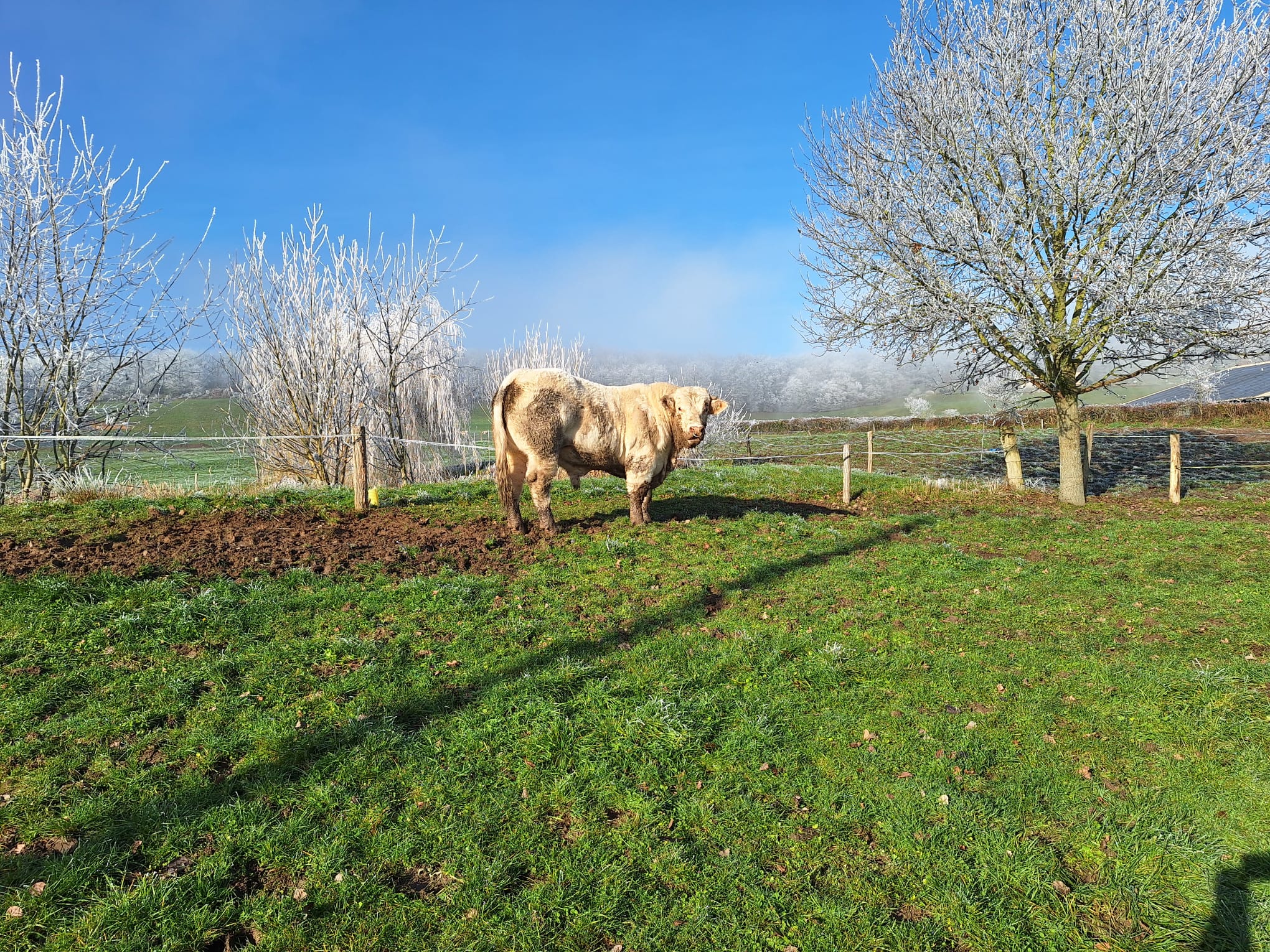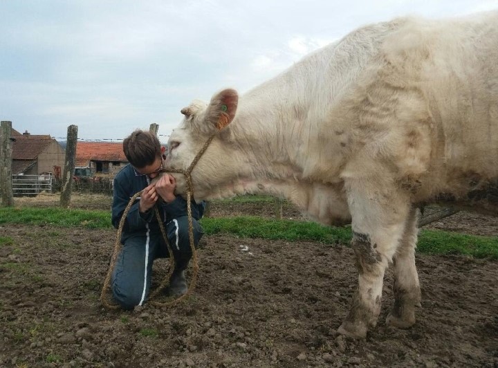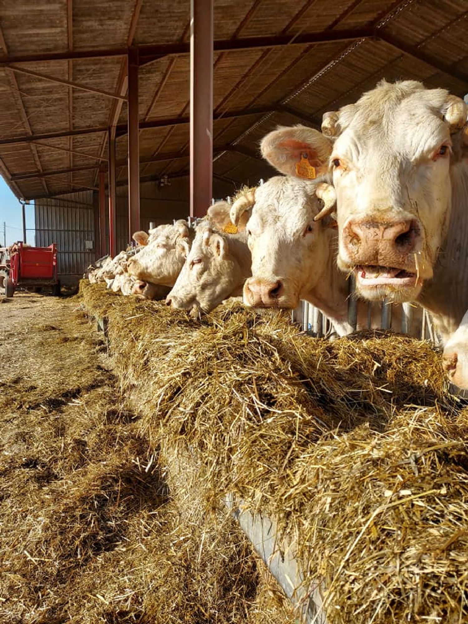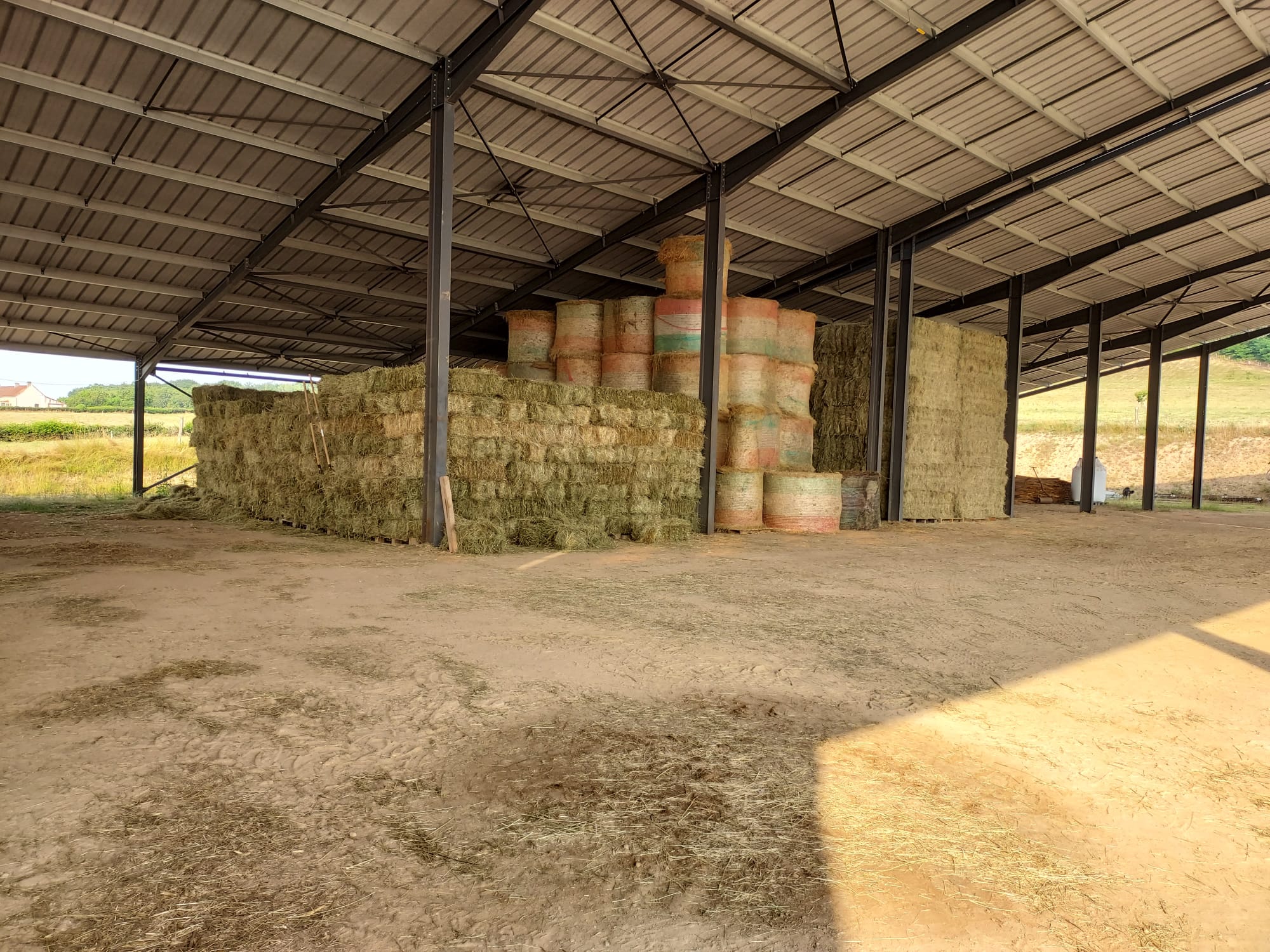 La surface de notre exploitation est de 210 hectares où nous cultivons de l'herbe pour nos animaux et environ 25 hectares de céréales (blé, orge, triticale, épeautre, avoine et méteil) pour la complémentation de nos animaux ainsi que la paille pour leur confort hivernal...